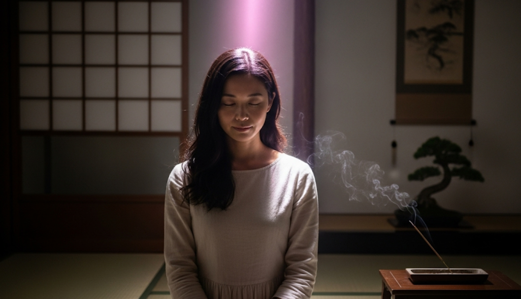 静かな場所に座り、目を閉じて、胸の中心に美しいピンク色の光が輝いているのをイメージします。